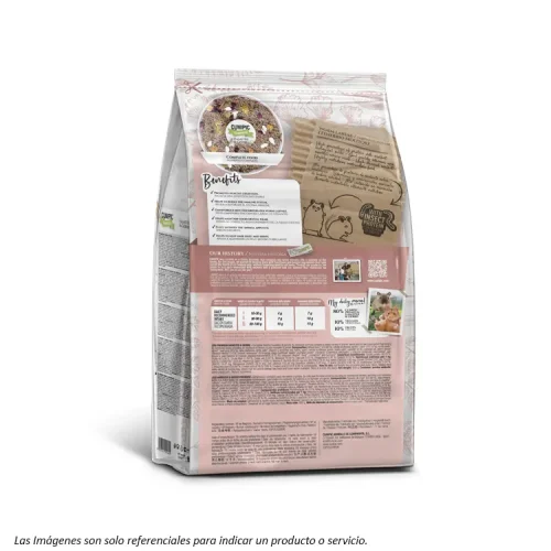Este alimento combina croquetas prensadas en frío, heno de calidad, verduras deshidratadas y flores comestibles, todo en proporciones balanceadas para evitar selección y carencias.