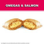 Salmón, pollo, arroz integral, proteína de trigo, harina de trigo, proteína de maíz, grasas animales, remolacha azucarera, huevo en polvo, aceite de pescado. Aditivos sensoriales: Sabor a salmón.
