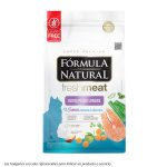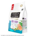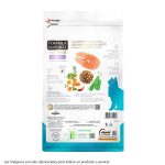 Carnes seleccionadas (carne de salmón separada mecánicamente (10%), carne de pollo e hígado de pollo separados mecánicamente), harina de chicharrones, harina de viceras de pollo, harina de mandioca, fécula de mandioca, harina de guisantes, fécula de papa, aceite de pollo, aceite de pescado, hidrolizado de ave e hígado, fibra de caña de azúcar, harina de camote, salvado de guayaba, frutas y verduras deshidratadas (zanahorias (0,5%), mango, manzana), pulpa de remolacha, harina de linaza, cloruro de sodio, biomasa de microalgas (Schizochytrium sp.), pared celular de levadura, inulina, fructooligosacáridos, extracto de yuca. (0,04%), vitaminas (A, D3, E, K3, B1, B2, B5, B6, B12, C, ácido fólico, niacina, biotina, cloruro de colina), minerales (sulfato de hierro, sulfato de cobre, sulfato de manganeso, sulfato de zinc, yodato de calcio, selenito de sodio, proteinato de zinc, levadura enriquecida con selenio, proteinato de manganeso), cloruro de potasio, lisina, metionina, taurina, ácido propiónico, ácido fosfórico, ácido cítrico, extracto de aloe vera (0,01%), extractos de té verde, menta y romero, concentrado de tocoferol (0,01%).